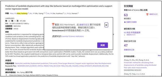 (通讯员:黄静)根据2021年7月基本科学指标数据库(Essential Science Indicators,简称ESI)最新数据显示,威廉希尔官网 苗发盛副教授、吴益平教授团队于2018年在国际工程地质领域顶级期刊《Landslides》上发表的学术论文“Prediction of landslide displacement with step-like behavior based on multialgorithm optimization and a support vector regression model” 入选ESI高被引论文(Highly Cited Paper)。