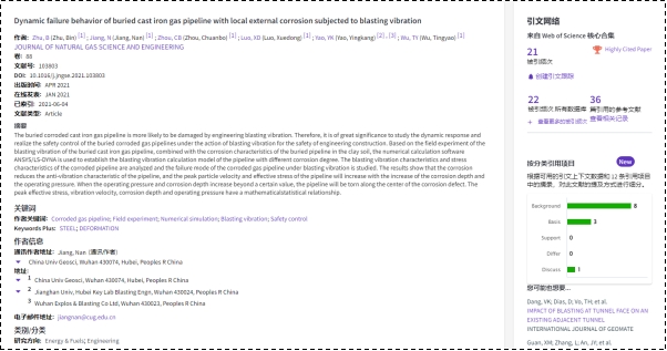 (通讯员:黄静)根据2022年5月基本科学指标数据库(Essential Science Indicators,简称ESI)最新数据显示,威廉希尔官网 地下空间工程系蒋楠副教授团队于2021年在国际工程技术权威期刊Journal of Natural Gas Science and Engineering上发表的学术论文“Dynamic failure behavior of buried cast iron gas pipeline with local external corrosion subjected to blasting vibration”入选ESI高被引论文(Highly Cited Paper)。该论文第一作者为2020级博士研究生朱斌,通讯作者为蒋楠副教授,中国地质大学(武汉)威廉希尔官网 为第一署名单位。