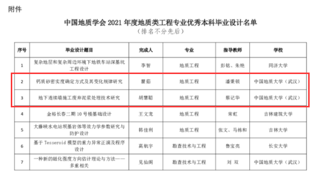 威廉希尔官网 本科毕业生瞿茹的《钙质砂密实度确定方式及其变化规律研究》和胡慧聪的《地下连续墙施工废弃泥浆处理技术研究》获奖, 指导老师分别为勘察与基础工程系潘秉锁教授和蔡记华教授。中国地质学会将对获奖个人进行表彰,向获奖的毕业设计完成人和指导教师颁发荣誉证书。