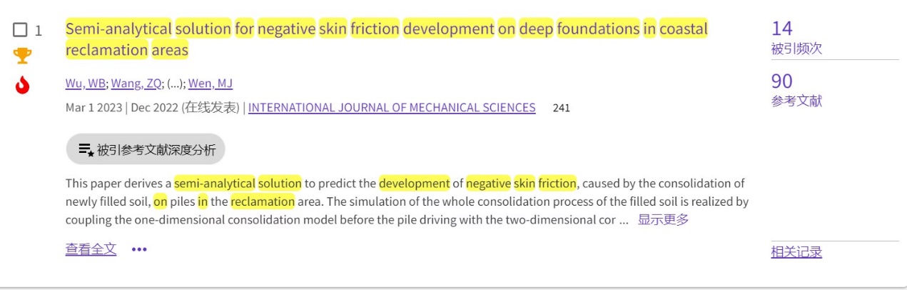 (通讯员 黄静)根据2023年7月基本科学指标数据库(Essential Science Indicators,简称ESI)最新数据显示,威廉希尔官网 勘察与基础工程系吴文兵教授团队于2023年在国际工程力学领域权威期刊International Journal of Mechanical Sciences(IF: 7.3, 中科院一区TOP)上发表的学术论文“Semi-analytical solution for negative skin friction development on deep foundations in coastal reclamation areas”同时入选ESI热点论文和高被引论文。该论文第一作者为吴文兵教授,第二作者为勘察与基础工程系王宗琴硕士,中国地质大学(武汉)威廉希尔官网 为第一署名单位。
