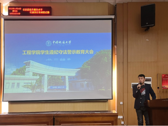 威廉希尔官网 党委副书记高晓东讲话。他指出,遵法、懂法、敬法、守法是对社会公民的基本要求,是对高校大学生思想和行为的底线约束,是当代青年成长为堪当民族复兴大任的时代新人的基本保障。作为新时代地大青年,一是要从全面依法治国战略的高度认识宪法法律法规学习的重要性,要认识到青年是法治中国建设的基础和希望,校园是开展青年法治教育的重要阵地,要采取集中学习和自主学习相结合、听取讲座和开展宣讲相结合等方式开展法律法规学习,强化规矩意识和法治思维,学会遵纪守法和合理维权,扣好人生第一粒扣子;二是要从大学生涯规划、职业生涯规划和人生发展规划的视角看待遵守校纪校规的重要性,牢牢把握“纪在法前、纪严于法”的原则,认识到高校纪律规矩对标约束的是“象牙塔”里的高知人群,支持的是“未来社会主义事业的建设者和接班人”的成长与发展,全体大学生理应对自己的思想和行为设置更高的标准和要求,争做遵规守纪的典范;三是要从“做强国建设、民族复兴的主力军”的视角对待大学主责主业,全体工程青年要潜心学课程、做学问、搞科研,用好宝贵的大学时光,产出更多、更高质量、更具影响力的研究成果,同时要注意守牢考风考纪和学术诚信底线。他还嘱咐全体同学,要积极参加心理普查,规律参与体育锻炼,不做“脆皮大学生”,要在初冬季节筑牢宿舍、教室、学习室、实验室用电安全“防火墙”,在校园车辆越来越密集的形势下筑牢交通出行安全“防火墙”,在防电信网络诈骗依然严峻复杂的形势下筑牢财物安全“防火墙”,共同为文明校园建设和个人成长发展营造良好的环境。