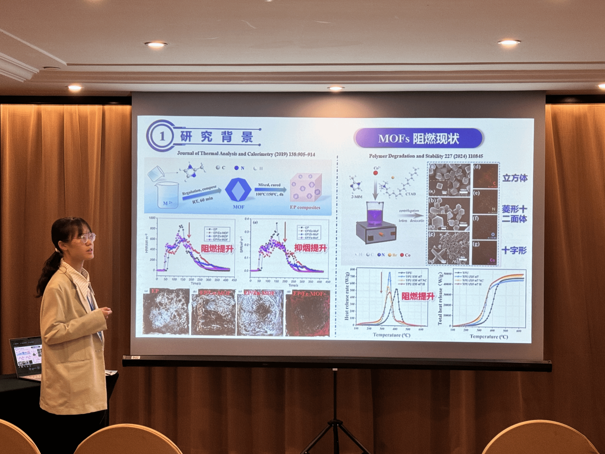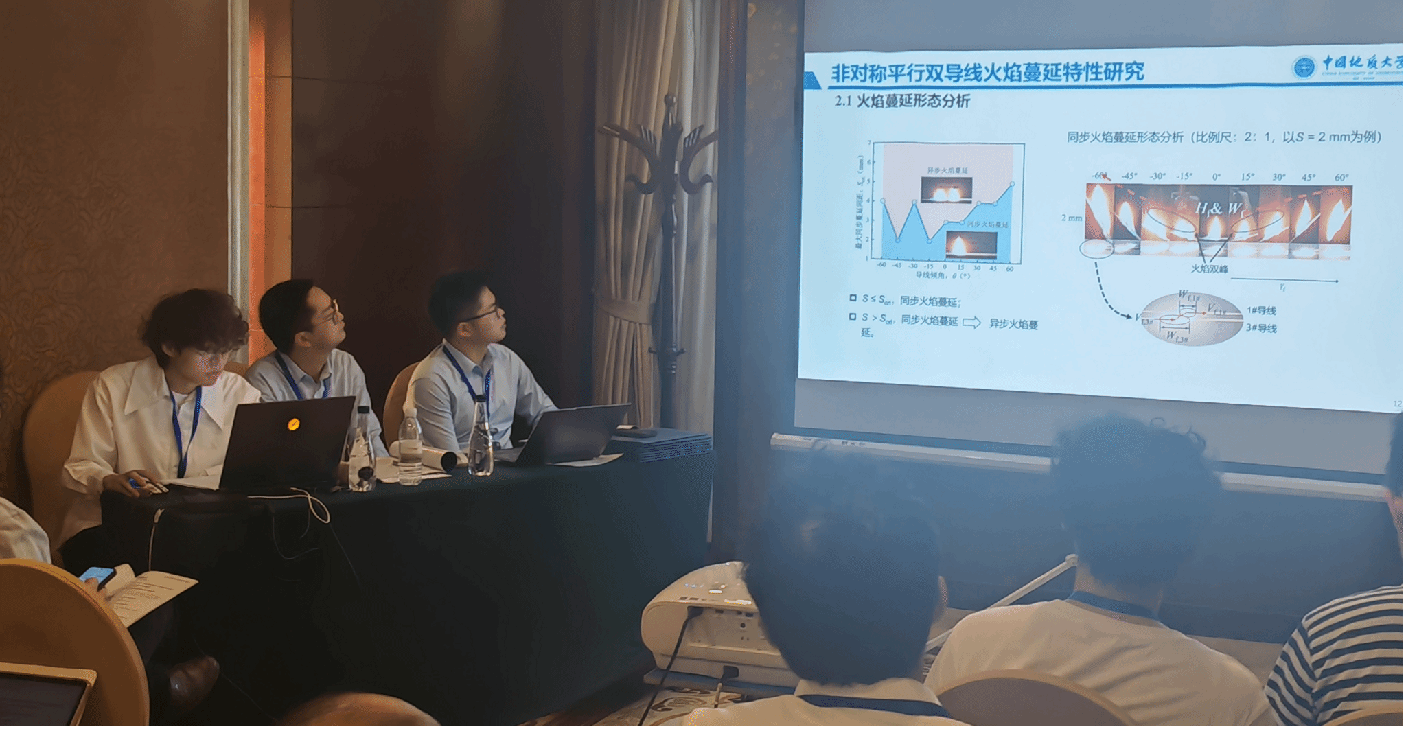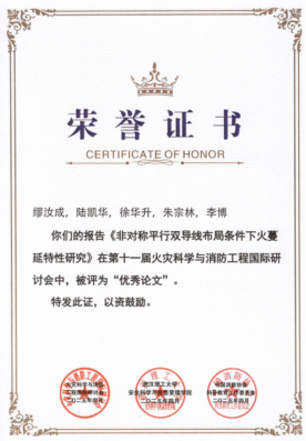 此外,威廉希尔官网 研究生印恋在阻燃耐火论坛作题为“卟啉基有机框架衍生物分子设计及其阻燃增韧研究”报告、罗瑊瑊在阻燃耐火论坛作题为“生物启发微中空MOFs的界面锁定效应:环氧树脂复合材料的耐火与增韧性能优化研究”报告、缪汝成在火灾机理论坛作题为“非对称平行双导线布局条件下火蔓延特性研究”报告,孟祥龙在火灾烟气论坛作题为“空气幕射流作用下的开口溢流发展行为研究”报告,宗志伟在受限空间火灾论坛作题为“墙角型壁面限制条件下的火羽流行为特性研究”报告。其中,陆凯华副教授指导的硕士研究生缪汝成获得会议优秀论文奖。