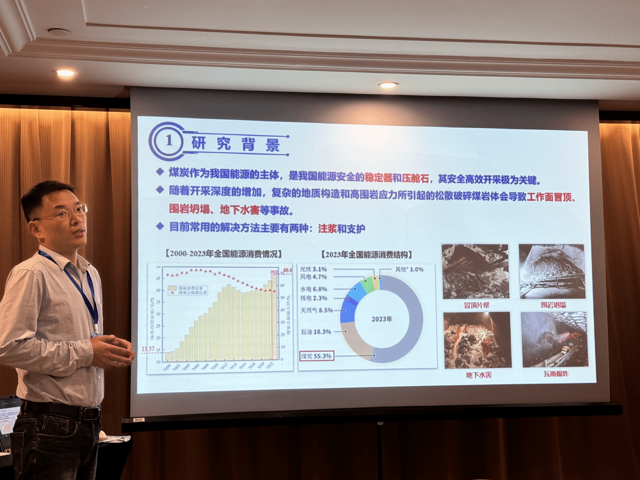 周克清特任教授作题为“阻燃、低蓄热聚氨酯注浆材料设计制备与性能研究”报告,他针对煤矿用聚氨酯注浆材料的反应放热量大、火灾危险性高、力学强度不足等关键科学问题,通过优化制备工艺和配方并引入导热填料和液态阻燃剂对其进行改性,获得了高安全性的聚氨酯注浆材料,这对于浆材在煤矿井下的大规模、安全化应用具有重要意义。