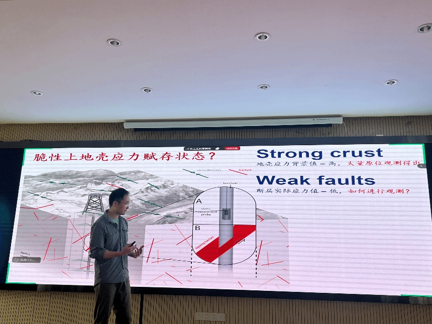 马晓冬教授作了题为“探索脆性上地壳的应力赋存状态—利用钻孔‘不常用’数据的反演”的学术报告,系统阐述了对脆性上地壳深部应力状态、地壳强度与应力场反演以及近断层精细应力变化研究的综合成果。报告核心聚焦于深地应力状态的总体认识、利用天然裂隙特征反演地壳强度和应力场与利用钻孔几何形态反演近断层应力精细变化三方面内容,研究基于库伦摩擦滑动理论,整合深井原位应力直接测量数据,论证了地壳整体处于临界应力平衡状态这一重要认识。报告深入探讨了地震活动性及断层稳定性与关键地质力学参数(包括地应力大小与方向、孔隙压力、断层产状及摩擦系数)之间的复杂关联性。最终得出,地震事件理论上可发生于任何区域,且较小的孔隙压力变化即具备诱发地震的潜力。并提出可发掘利用钻孔(序列)更多应力指示物刻画应力空间变化,为我国西南地区深部洞室地应力的分析提供了借鉴性参考和方法支撑。鉴于地震系统固有的高度复杂性,研究所提出的理论框架与技术路径,有望引领该领域未来的重要研究方向。