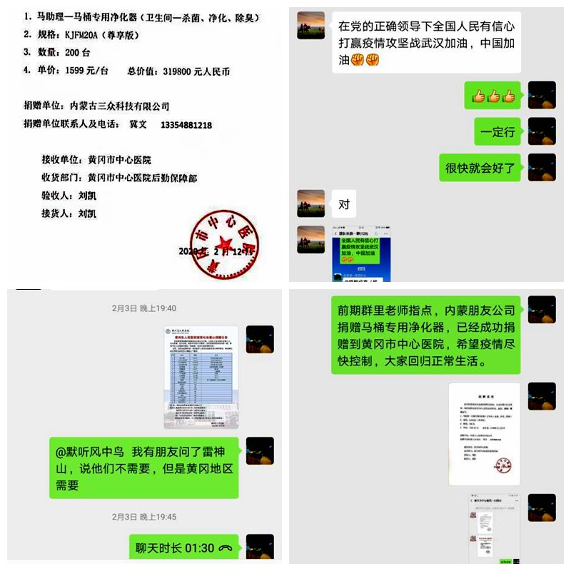 实验中心主任陈劲同志,在封城初期得知奋战在抗疫一线的医护工作者防护服紧缺,迅速通过自己的微信群发起动员,组织大家捐款捐物,共募集到价值三十多万元的善款及抗疫物资。其中,从内蒙古三众科技公司募集到的200台马桶专用净化器,在了解到武汉火神山医院暂时不能接收捐赠物资的时候,又转辗联系到黄冈市中心医院,从呼和浩特驱车1500多公里专程送达黄冈。